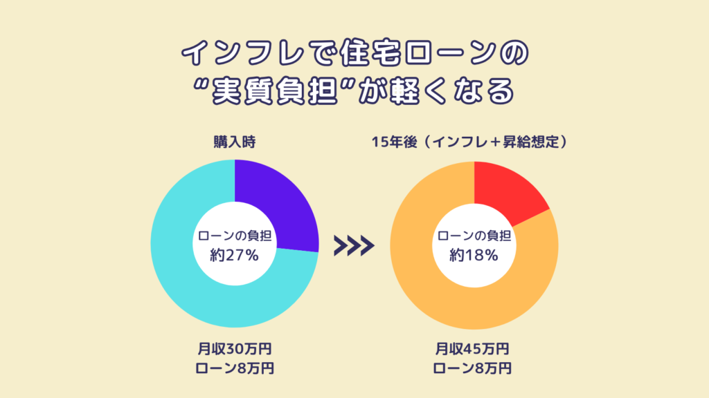 インフレが進むと、現金の価値は相対的に下がっていく一方で、住宅のような実物資産は価値を保ちやすい傾向があります。